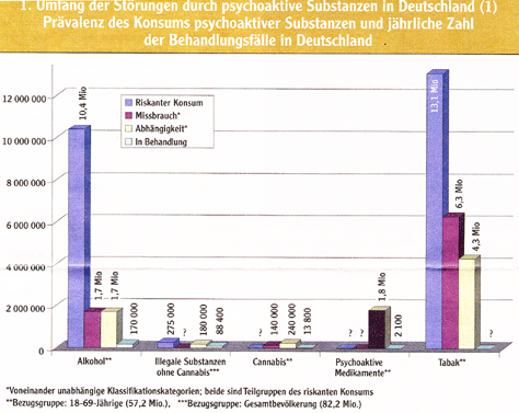 Weit hinten rangieren Cannabis (240.000Abhängige) und die anderen illegalen Substanzen wie Kokain, Heroin und Designerdrogen (180.000 Abgängige).